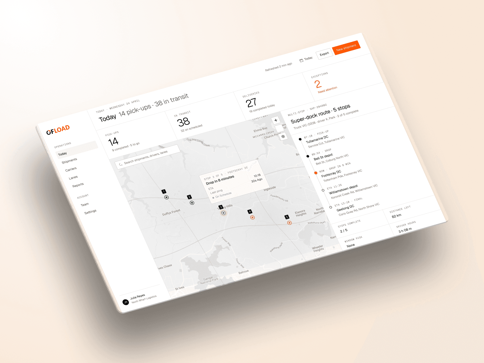 Ofload's shippers could book a shipment in minutes, but couldn't see it once it left the warehouse. I designed a live tracking dashboard that gave them real-time visibility, piloted with Sun Rice, and set the foundation for Ofload's DIFOT and dynamic ETA roadmap.