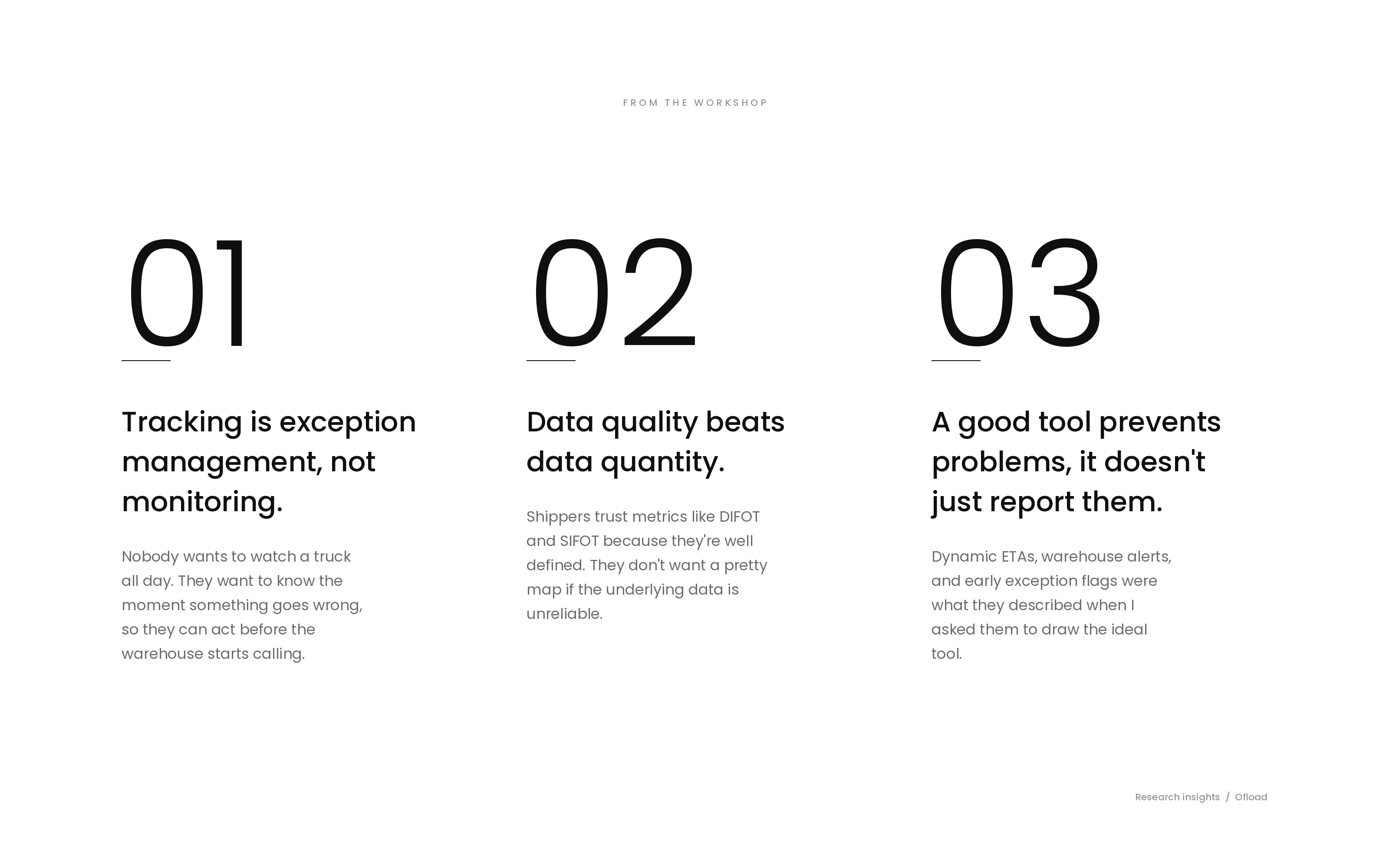 2. A single good workshop was worth ten internal opinions. The shift from "monitoring tool" to "exception management tool" came from the shippers, not the team. It changed the whole framing of the product.