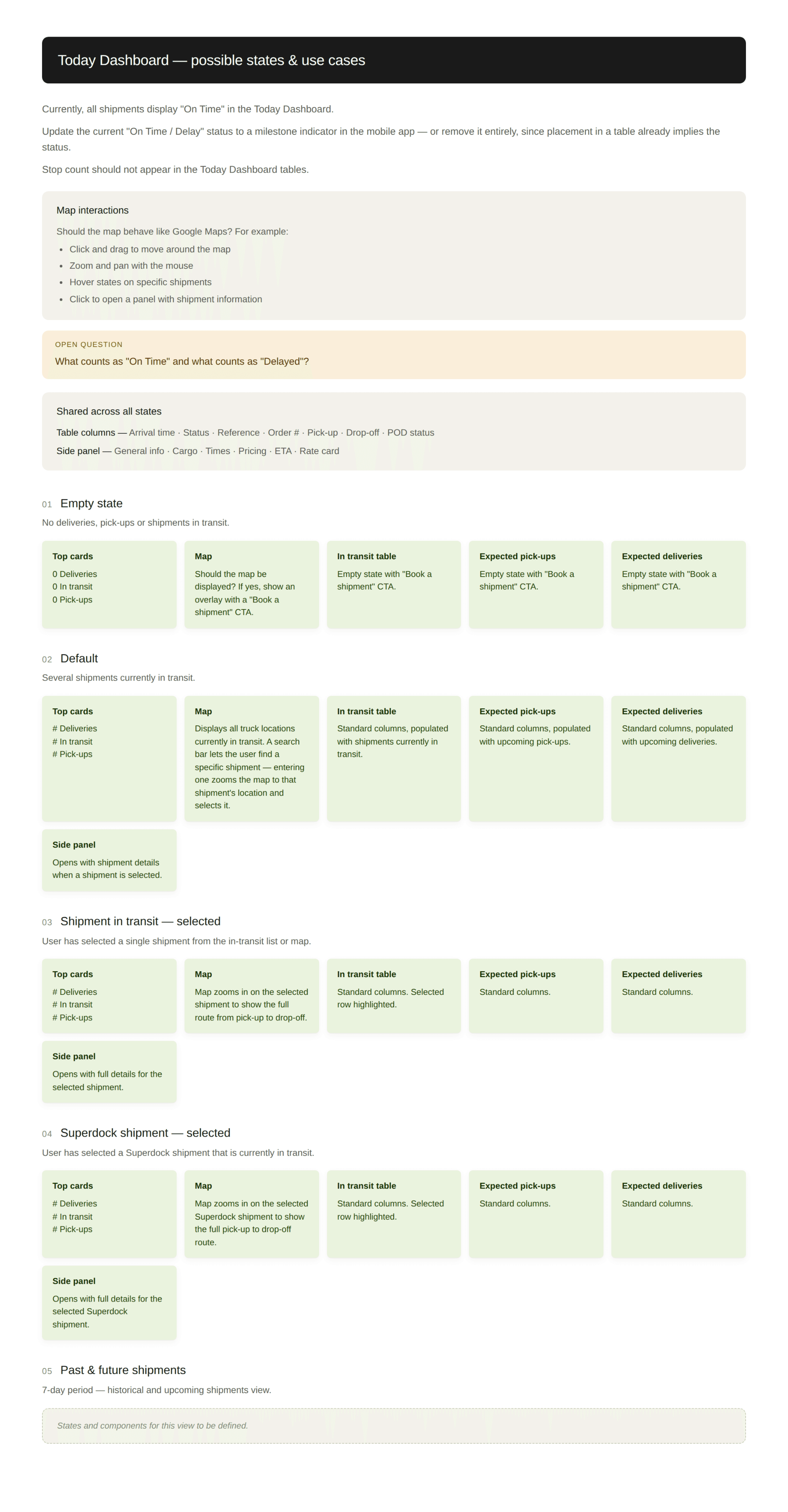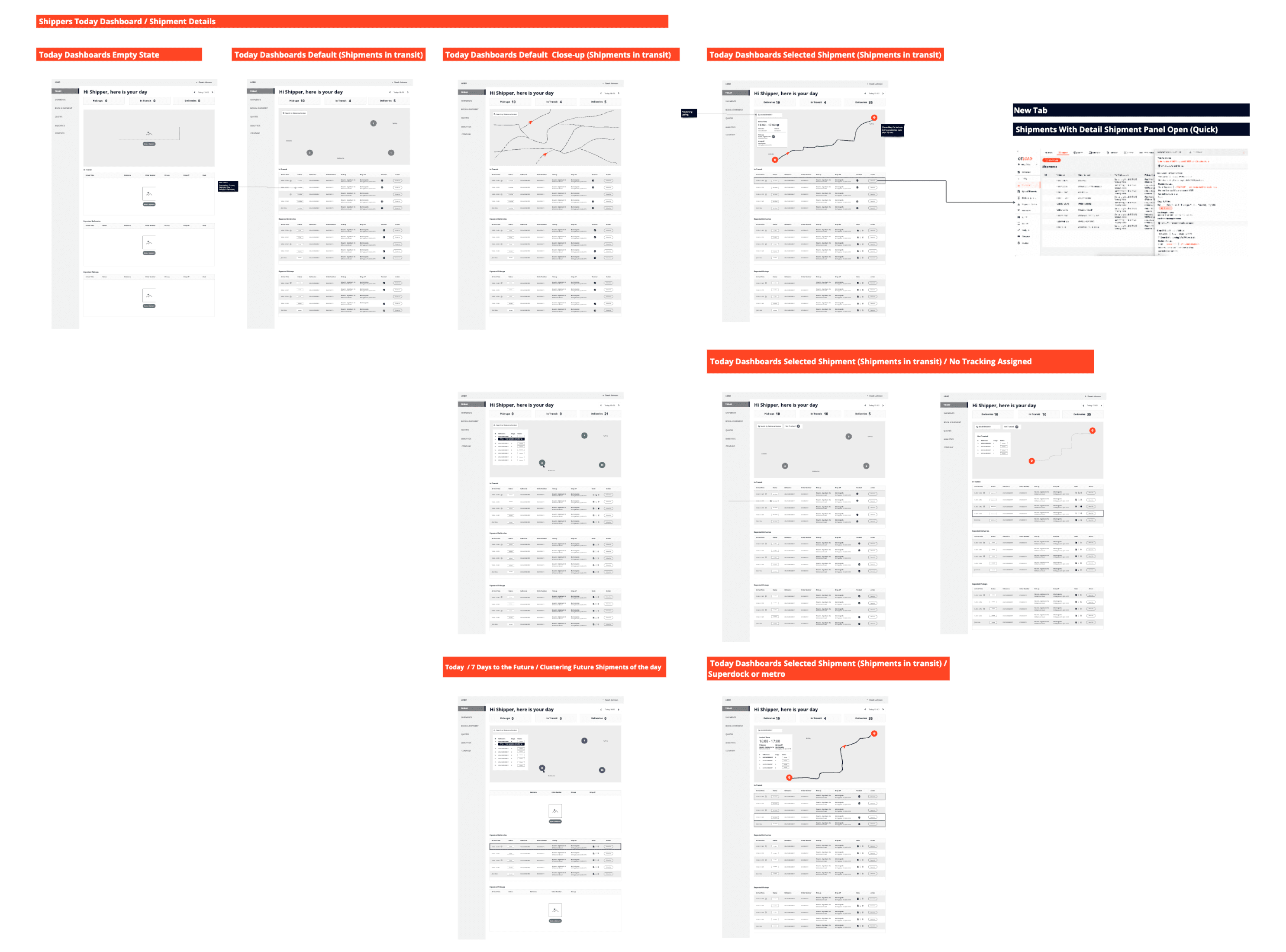I mapped each flow against the dashboard states: empty, default, shipment-selected, multi-stop, past shipments.